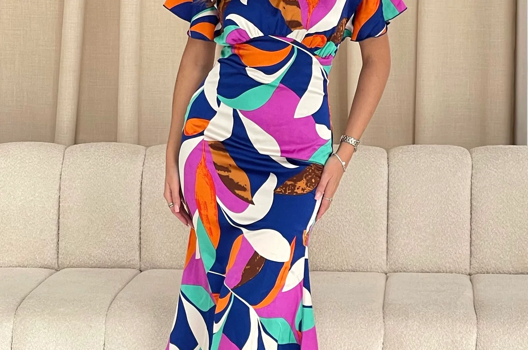 Soak up that Summer feeling in our Brittany Angel Sleeve Midi Dress. Crafted from luxurious floral print, this eye-catching piece features a frill sleeve design and ruched underbust to give you a flattering high-end look. Make a statement in this stunning dress.