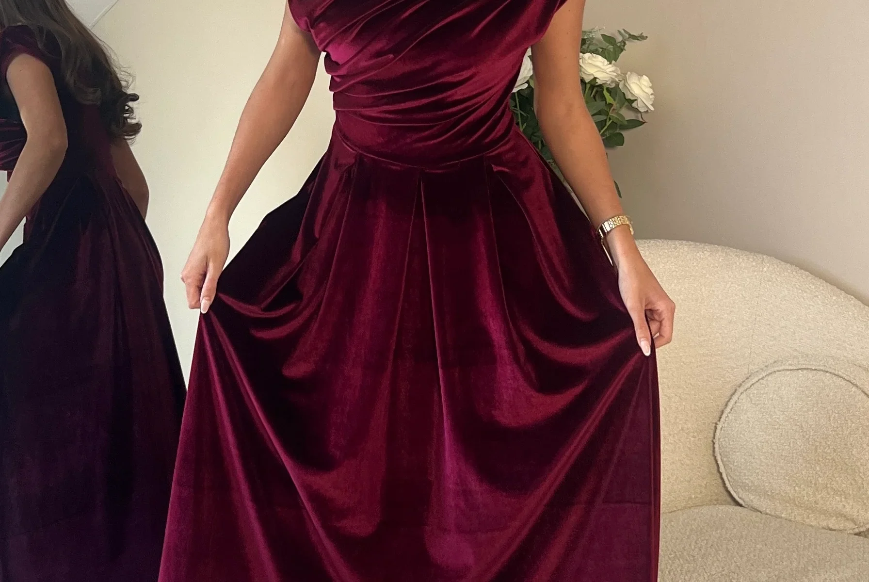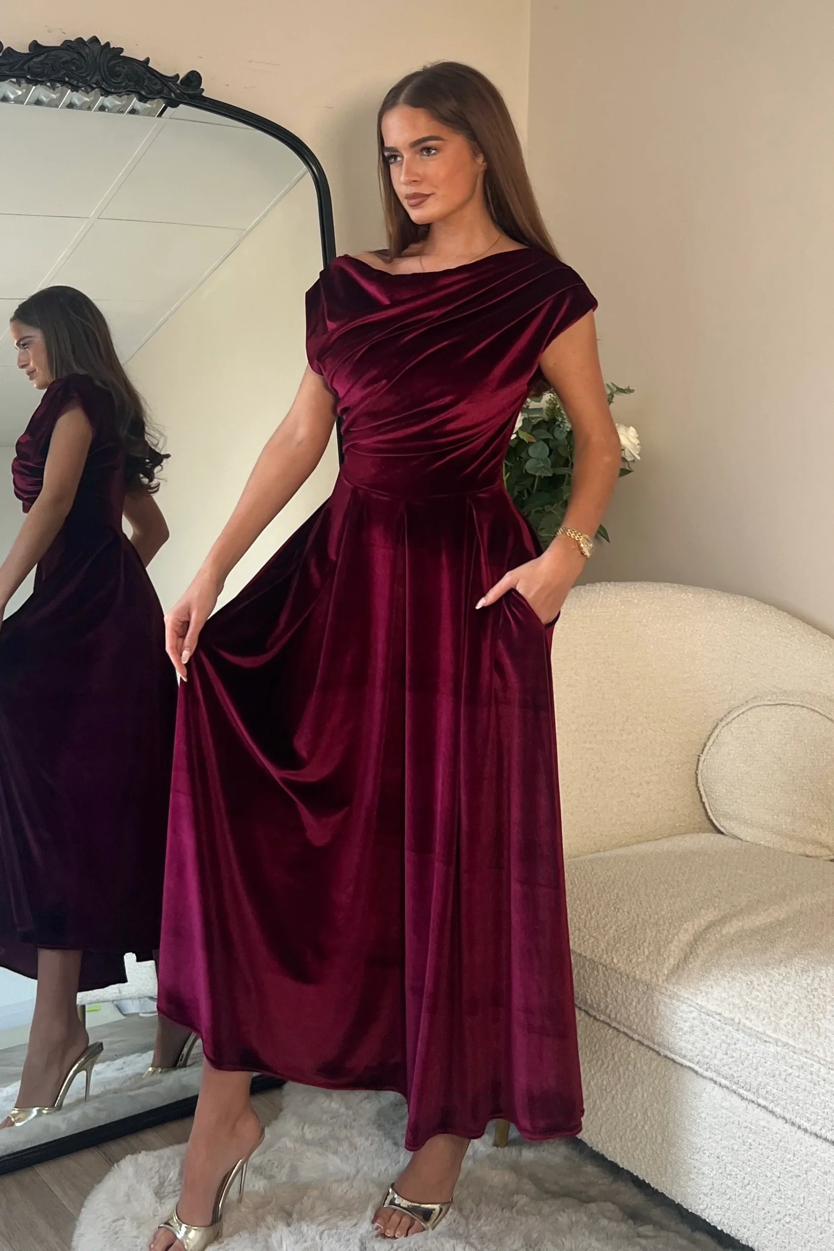 The Betty Asymmetric Neckline Midi Skater Dress in velvet BERRY is a statement piece. Crafted from the highest quality materials for a luxurious feel, its’ unique asymmetric neckline provides visual interest, while the sleek skater skirt silhouette flatters the figure, creating an exquisite look.