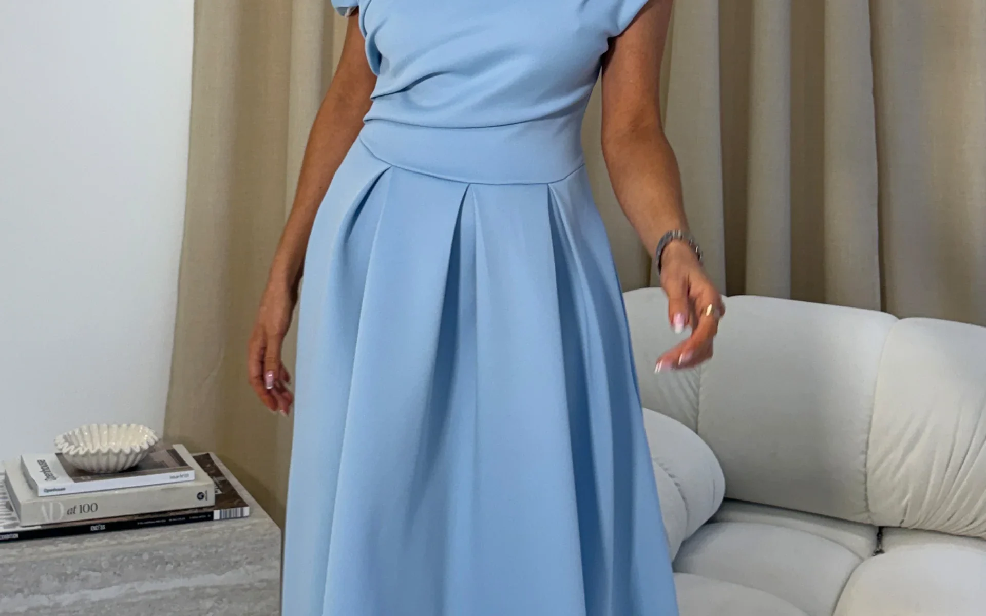 Experience modern elegance this Spring with the Betty Asymmetric Neckline Midi Skater Dress. This classic, statement piece in Sky BLUE is crafted from the highest quality materials for a luxurious feel. Its unique asymmetric neckline provides visual interest, while the sleek skater skirt silhouette flatters the figure, creating an exquisite look that will never go out of style.