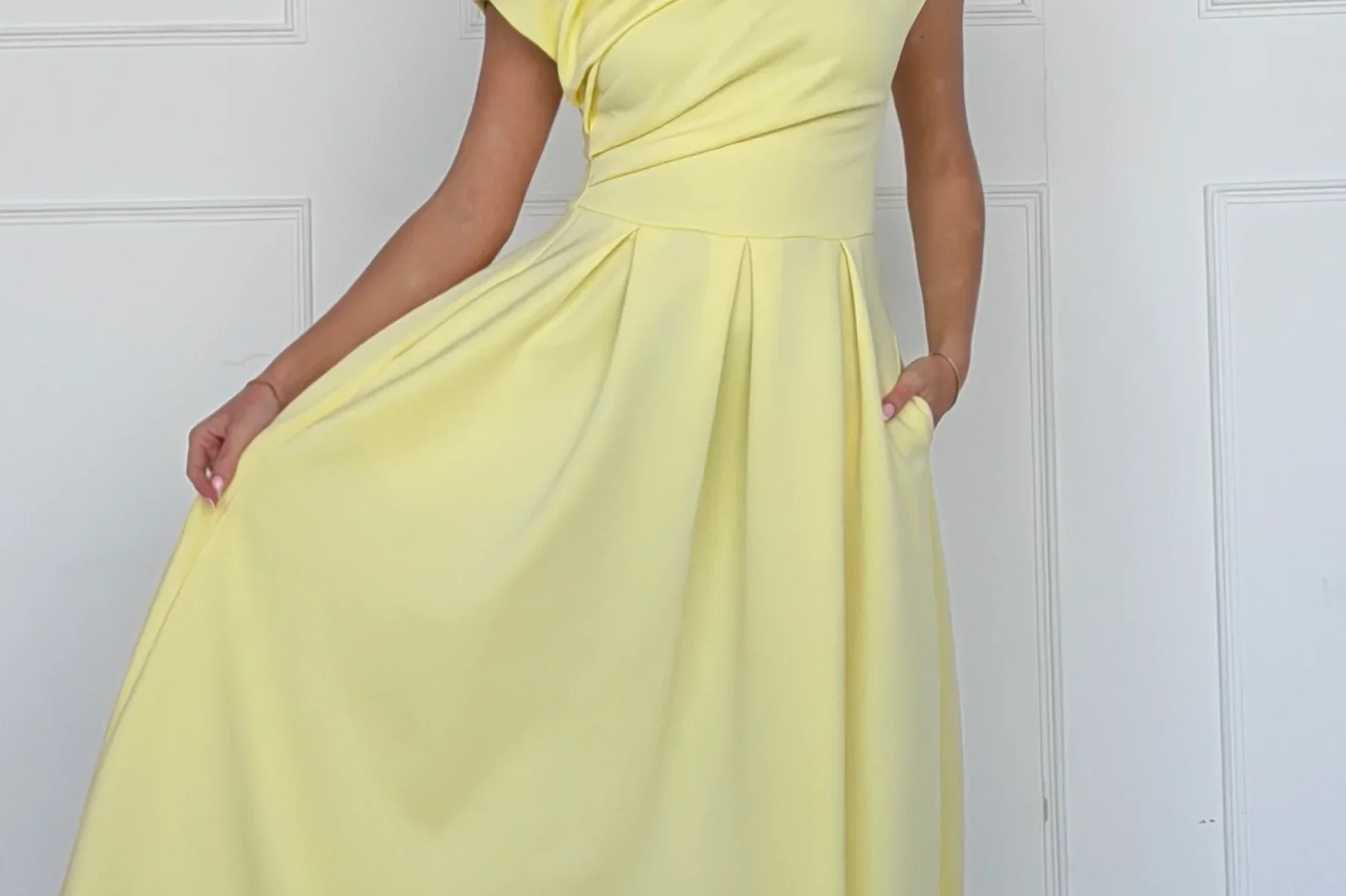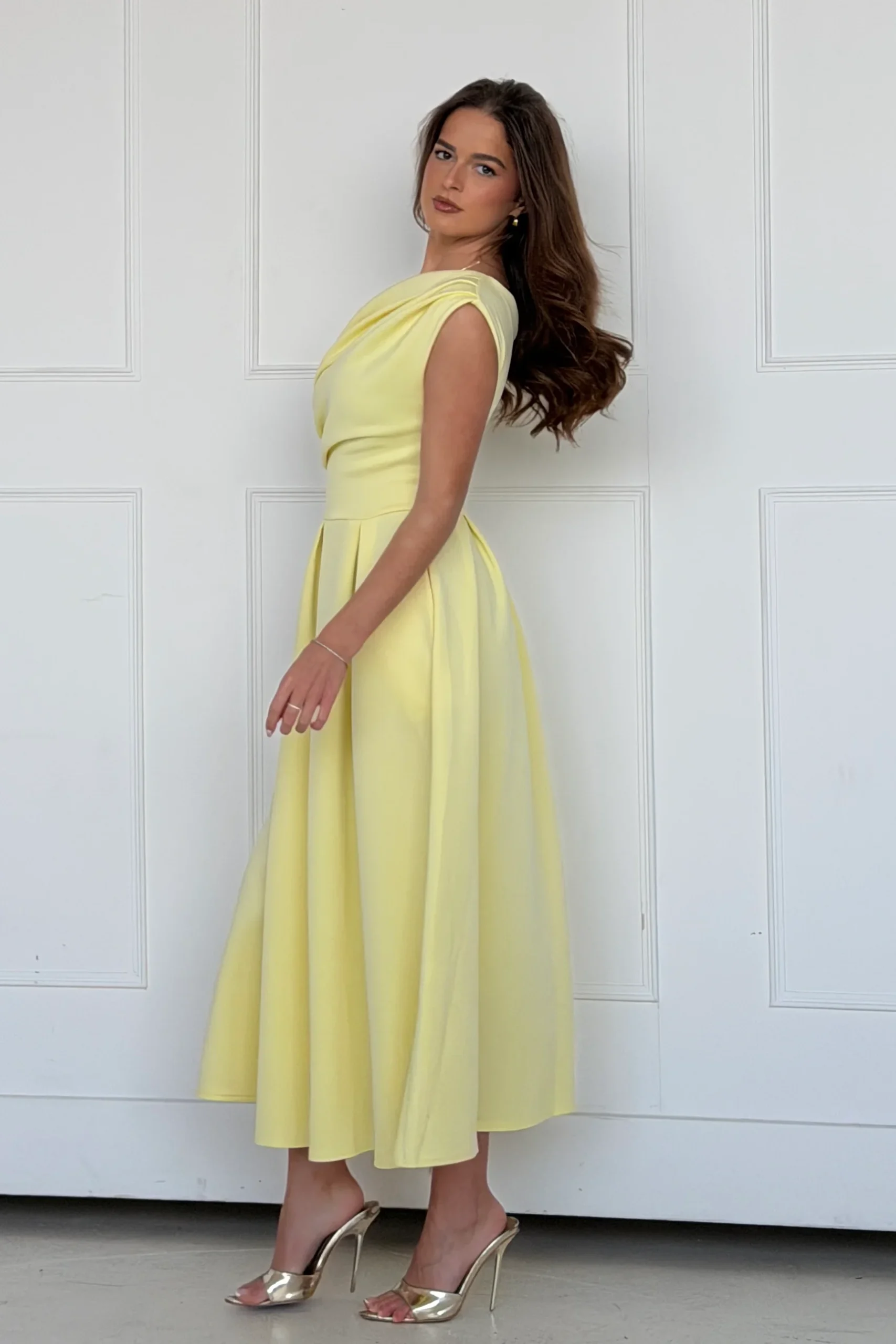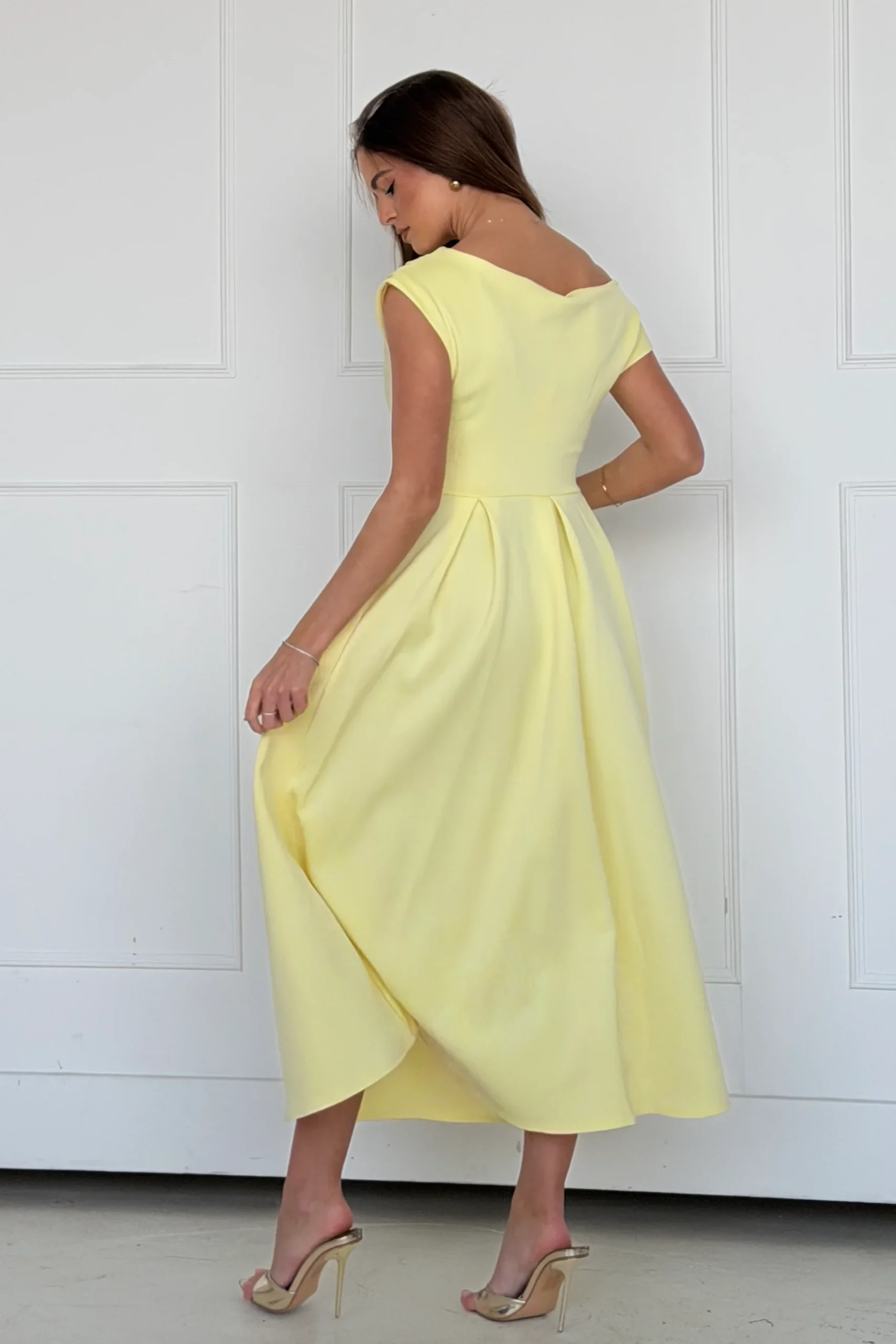 The Betty Asymmetric Neckline Midi Skater Dress in a zesty Yellow colour is a classic, statement piece. Crafted from the highest quality materials for a luxurious feel, its’ unique asymmetric neckline provides visual interest, while the sleek skater skirt silhouette flatters the figure, creating an exquisite look.