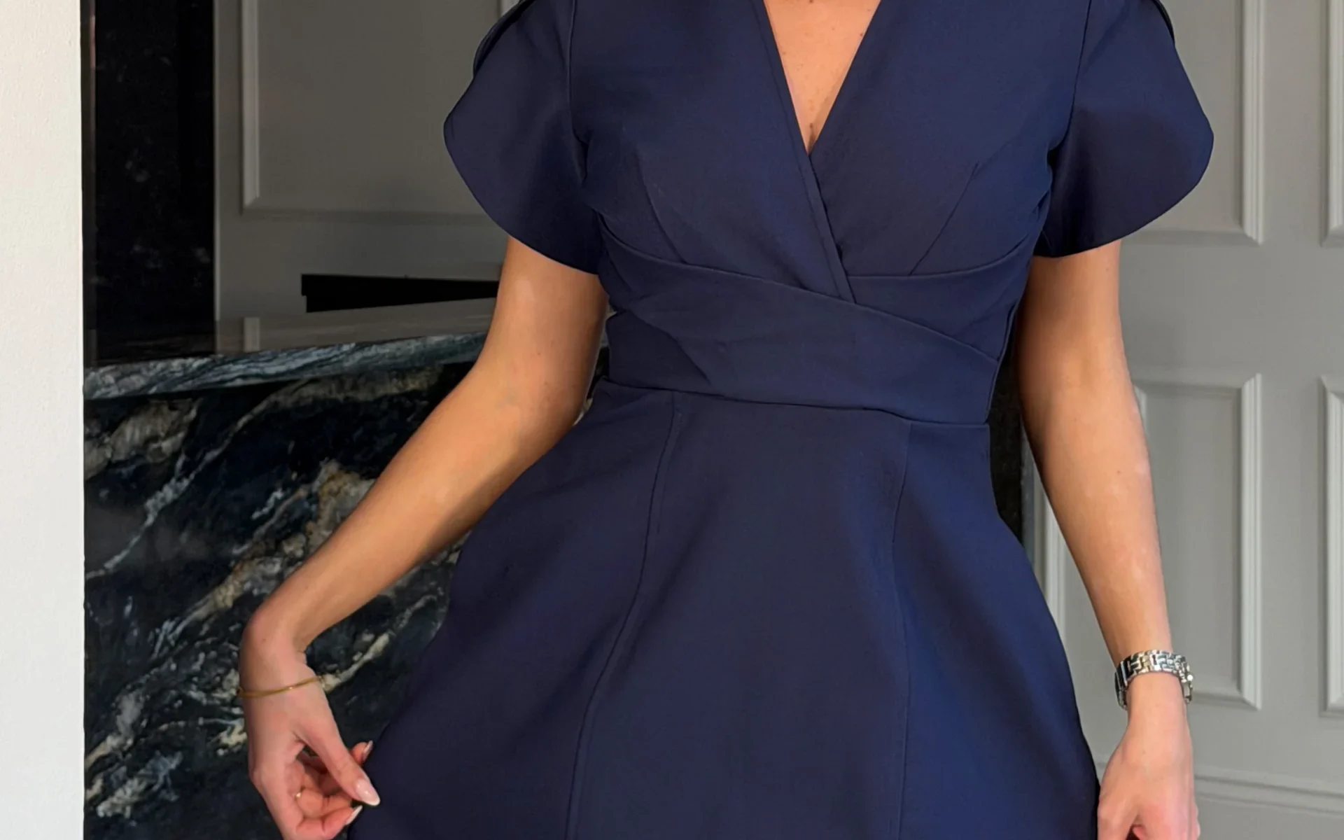 The Bridget Twist Front Split Arm Mini Dress in NAVY blue is a perfect choice for both formal events and chic evening outings. Featuring a sophisticated wrap front neckline and elegant tulip sleeves, this dress combines flirty mini length with a premium stretch fabric for a flawless, comfortable fit that moves with you.