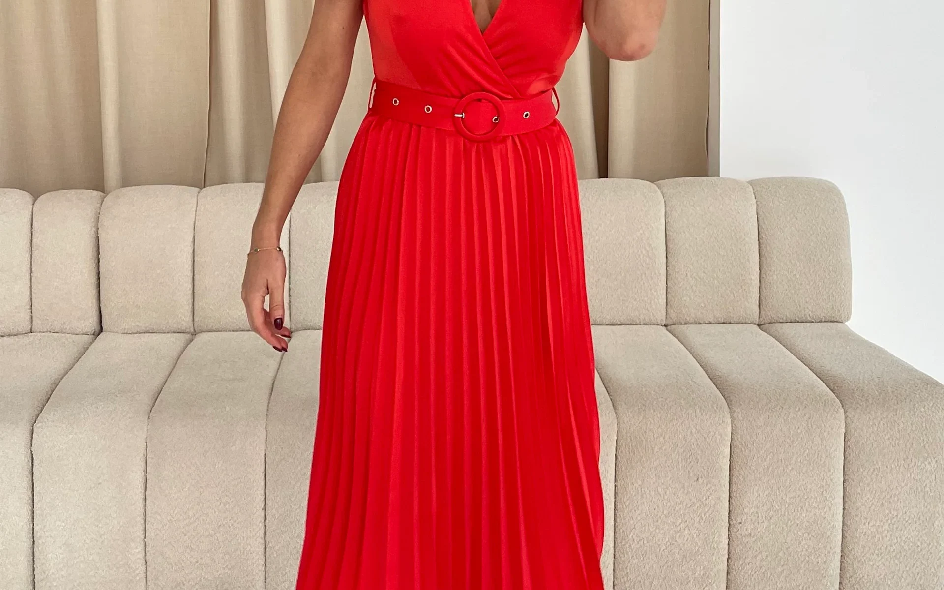Our Brooklyn Long Sleeve Asymmetric with Pleated Skirt is a show stopper. This Midi Dress in vibrant RED features a wrap neckline and flutter sleeves, and a cinched waist with a statement belt, that helps create a most flattering silhouette whilst enhancing your figure..