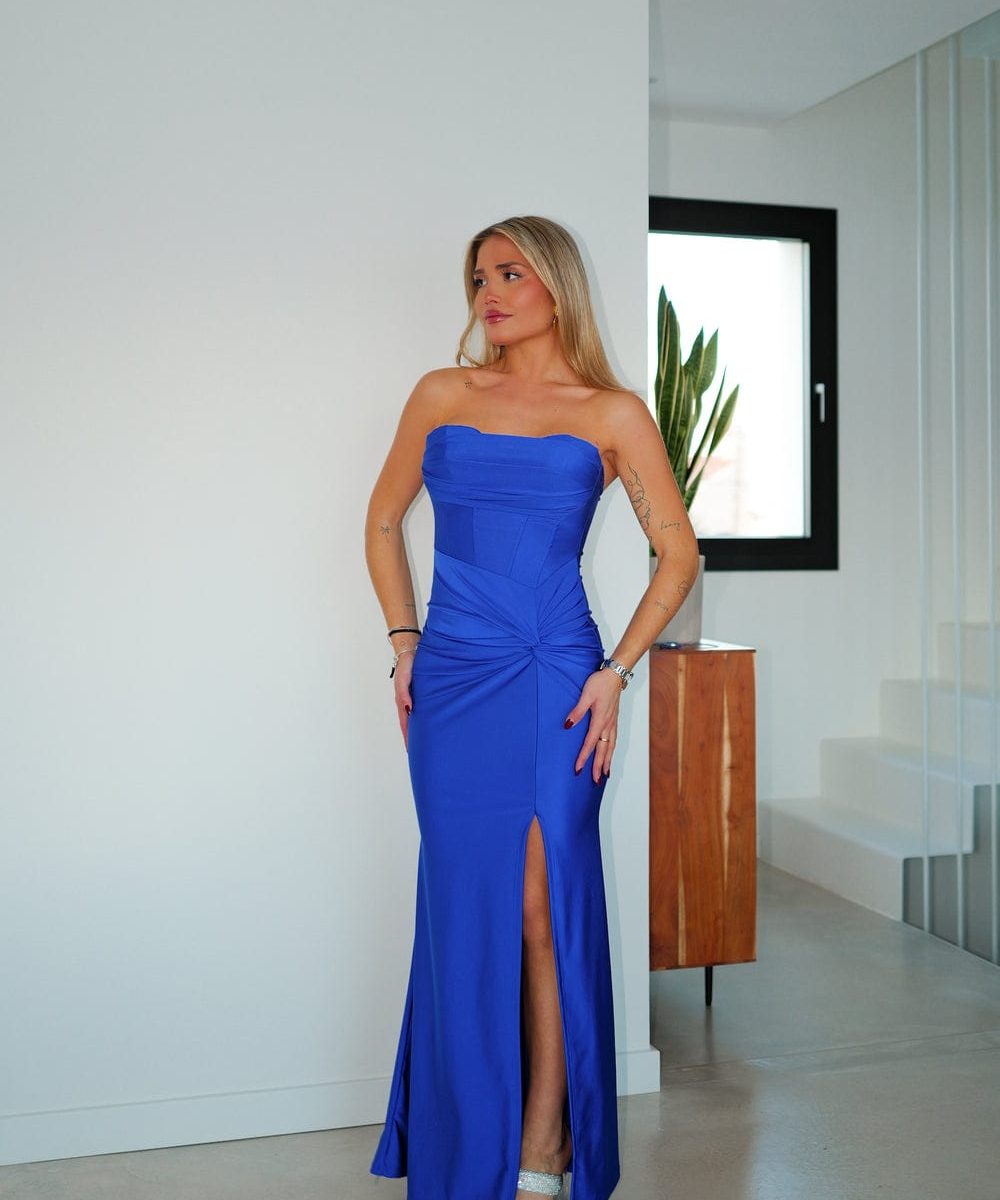 The Capri Corset Gown is certain to turn heads no matter what the occasion. This Full length dress features a high slit, with a flattering ruched knot detail, and an Open LACED UP BACK detail making for an ultra flattering fit.