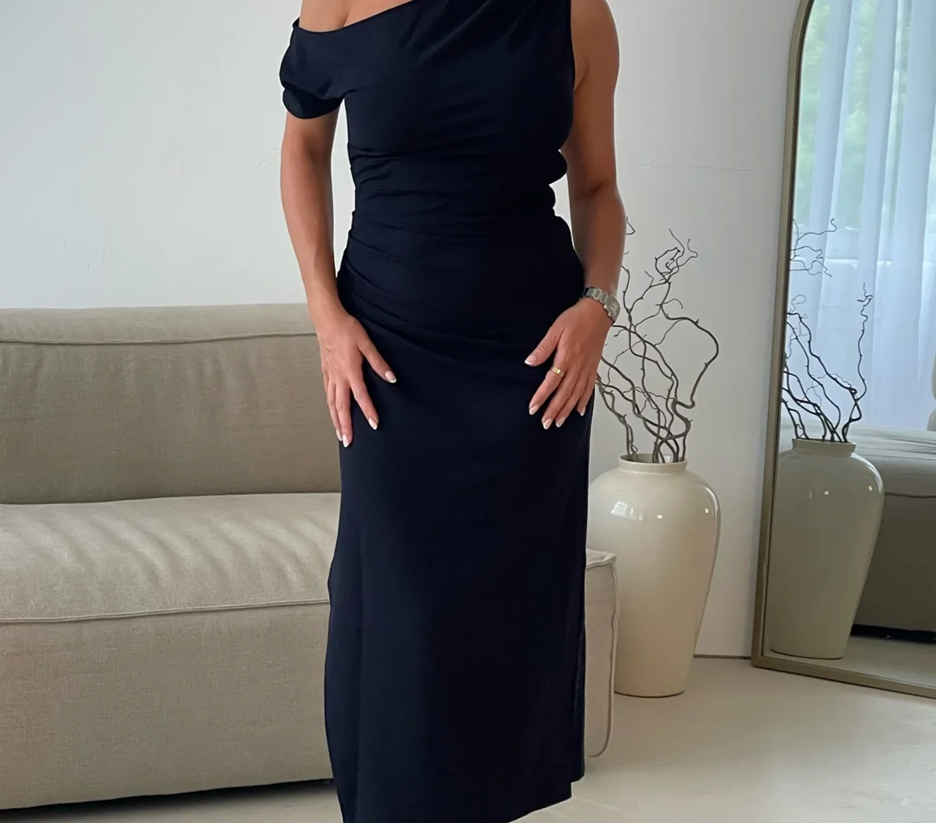 One of our Best Sellers, the Donna Midi Dress in pulsating Navy with an Asymmetric Neckline is a classic, timeless piece. Its unique asymmetric neckline provides visual interest, while the sleek midi skirt silhouette flatters the figure, creating an exquisite look that will never go out of style.