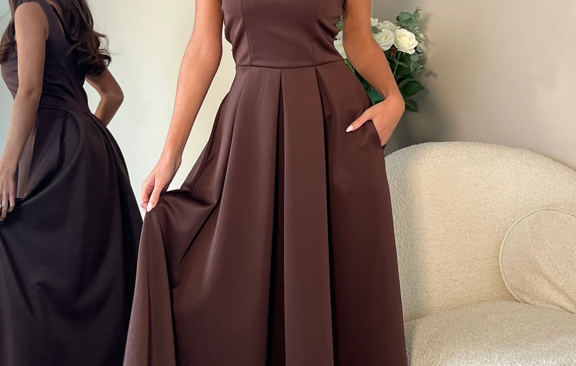 Step out in ultimate style in our Erica Square Neck Midi Dress in a lovely Autumnal BROWN. Crafted in a premium stretch fabric, beautifully flowing with a cinched in waist, this midi dress boasts a pleated skirt that creates an elegant sense of movement. Perfect for any occasion. Pair with heels or sandals. The choice is yours!