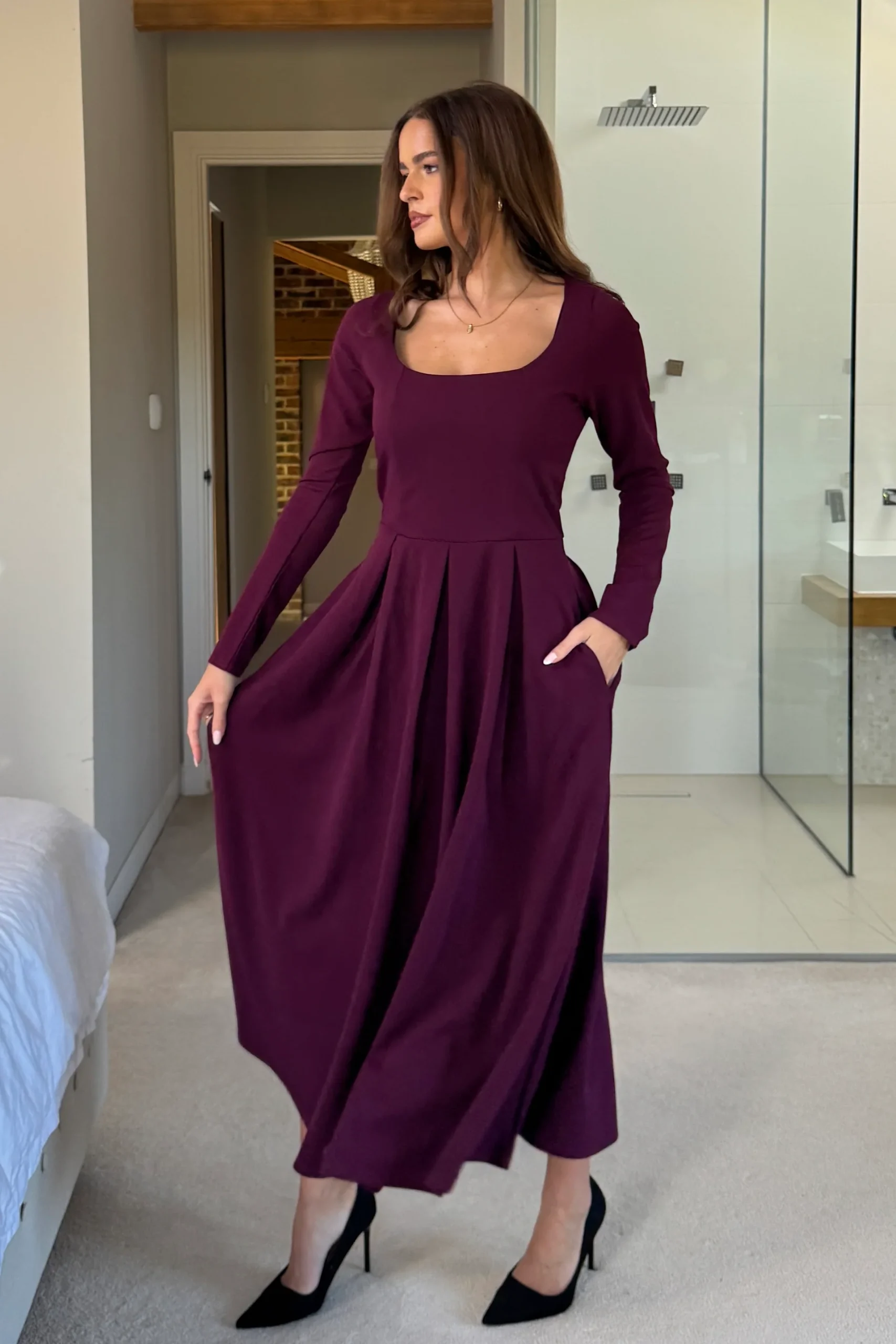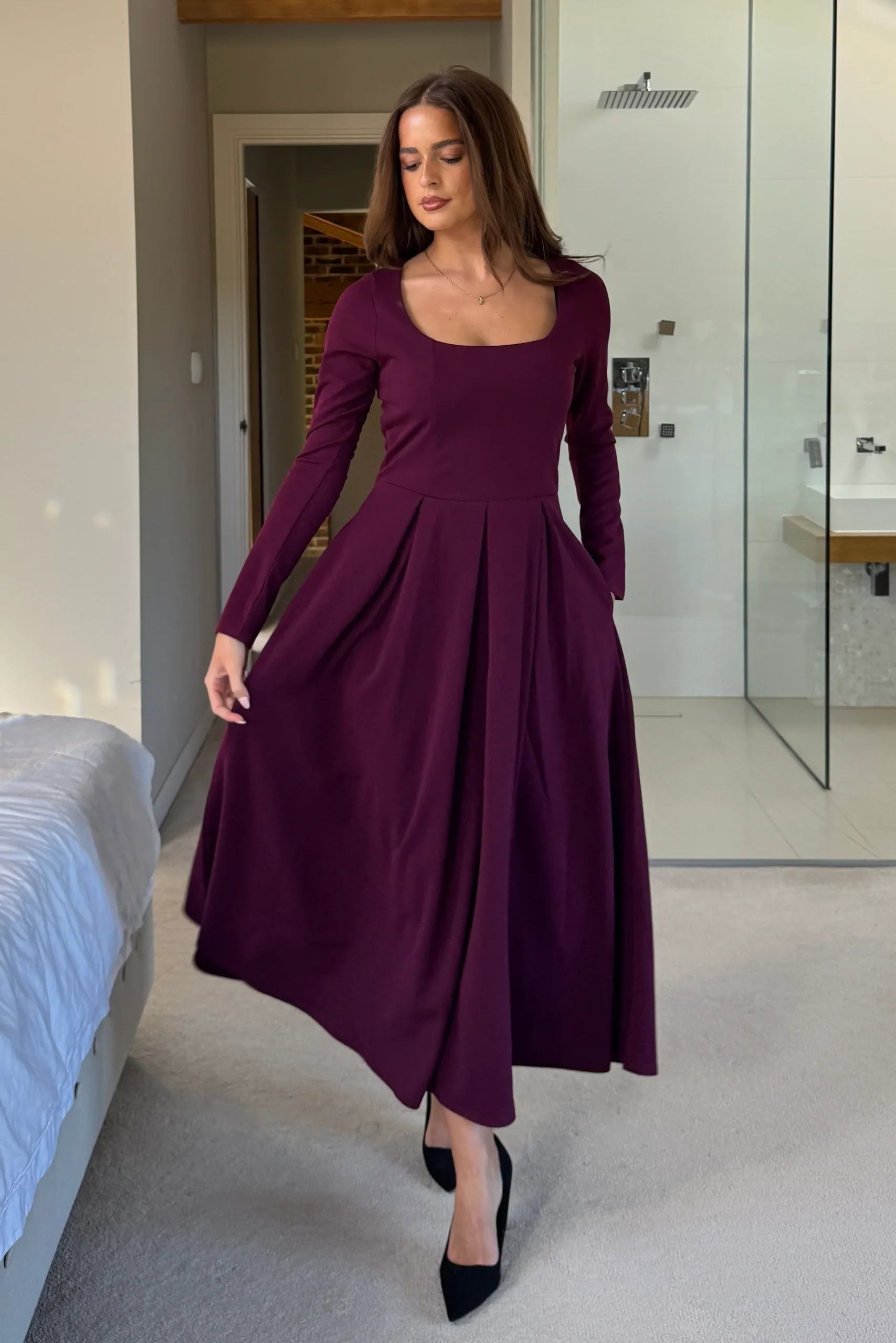 Step out this Autumn/Winter season in ultimate style in our Evie Square Neck Midi Dress in a beautiful WINE hue. Crafted from our premium scuba crepe, this dress is designed to sculpt and smooth while offering a polished silhouette. The structured square neckline and long sleeves create a timeless, tailored feel, while the softly pleated skirt adds graceful movement with every step. Perfect for elevated occasions or sophisticated evenings.