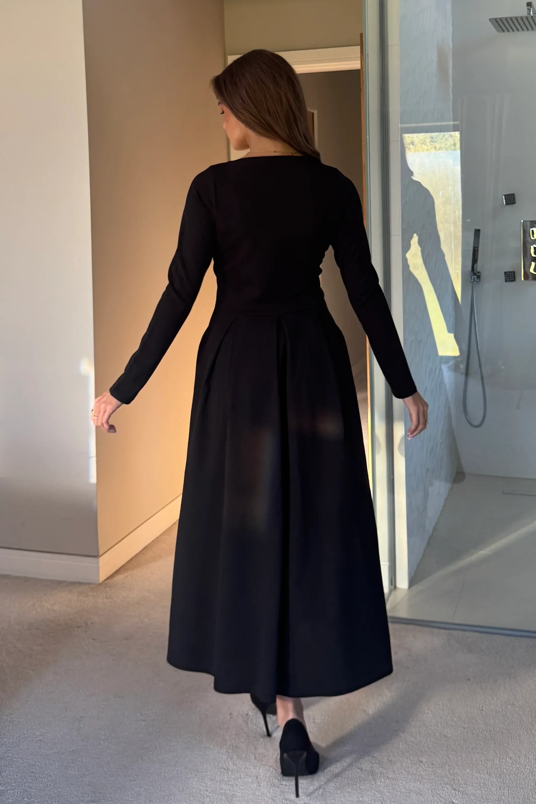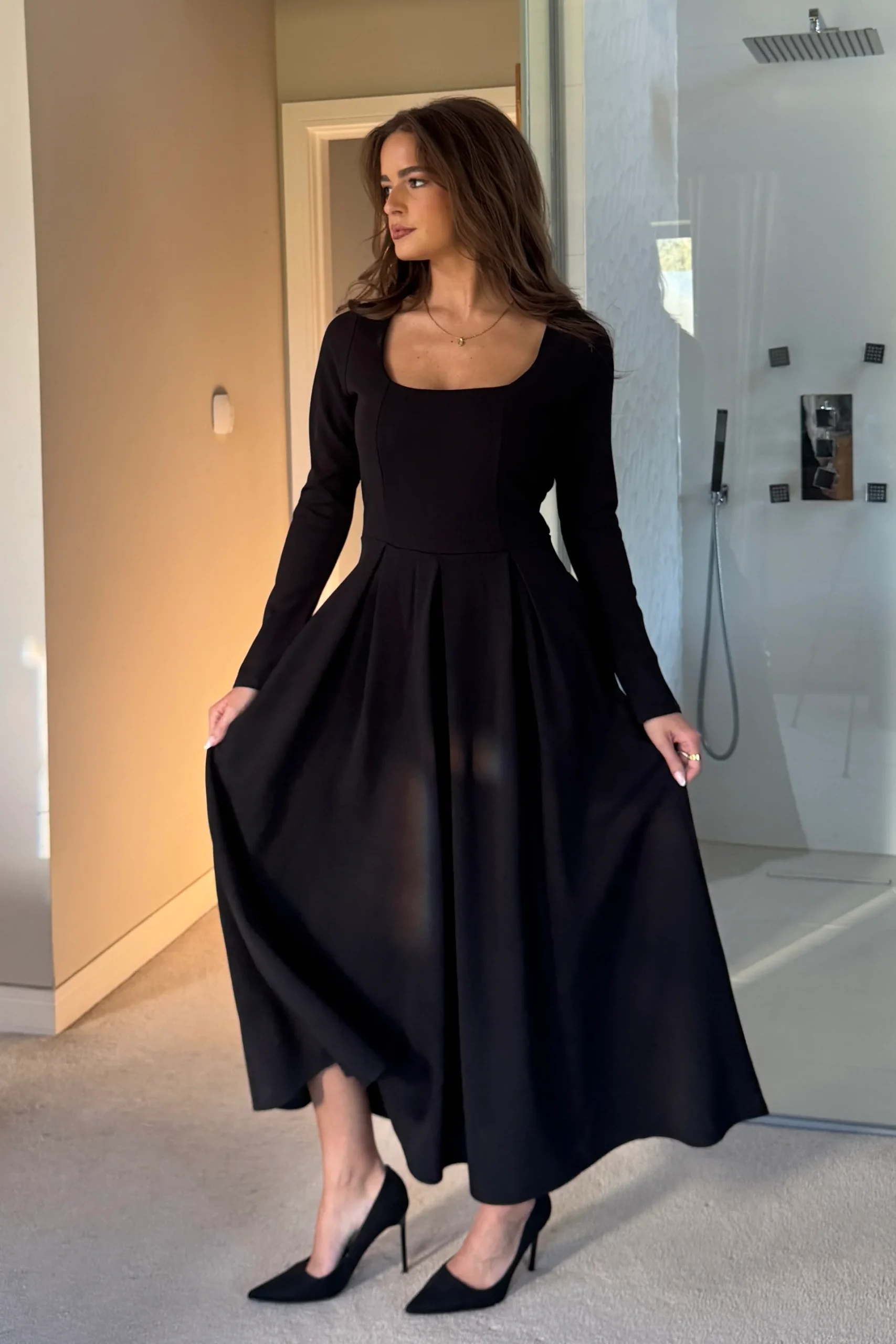 Step out this Autumn/Winter season in ultimate style in our Evie Square Neck Midi Dress. Crafted from our premium scuba crepe, this BLACK midi dress is designed to sculpt and smooth while offering a polished silhouette. The structured square neckline and long sleeves create a timeless, tailored feel, while the softly pleated skirt adds graceful movement with every step. Perfect for elevated occasions or sophisticated evenings.