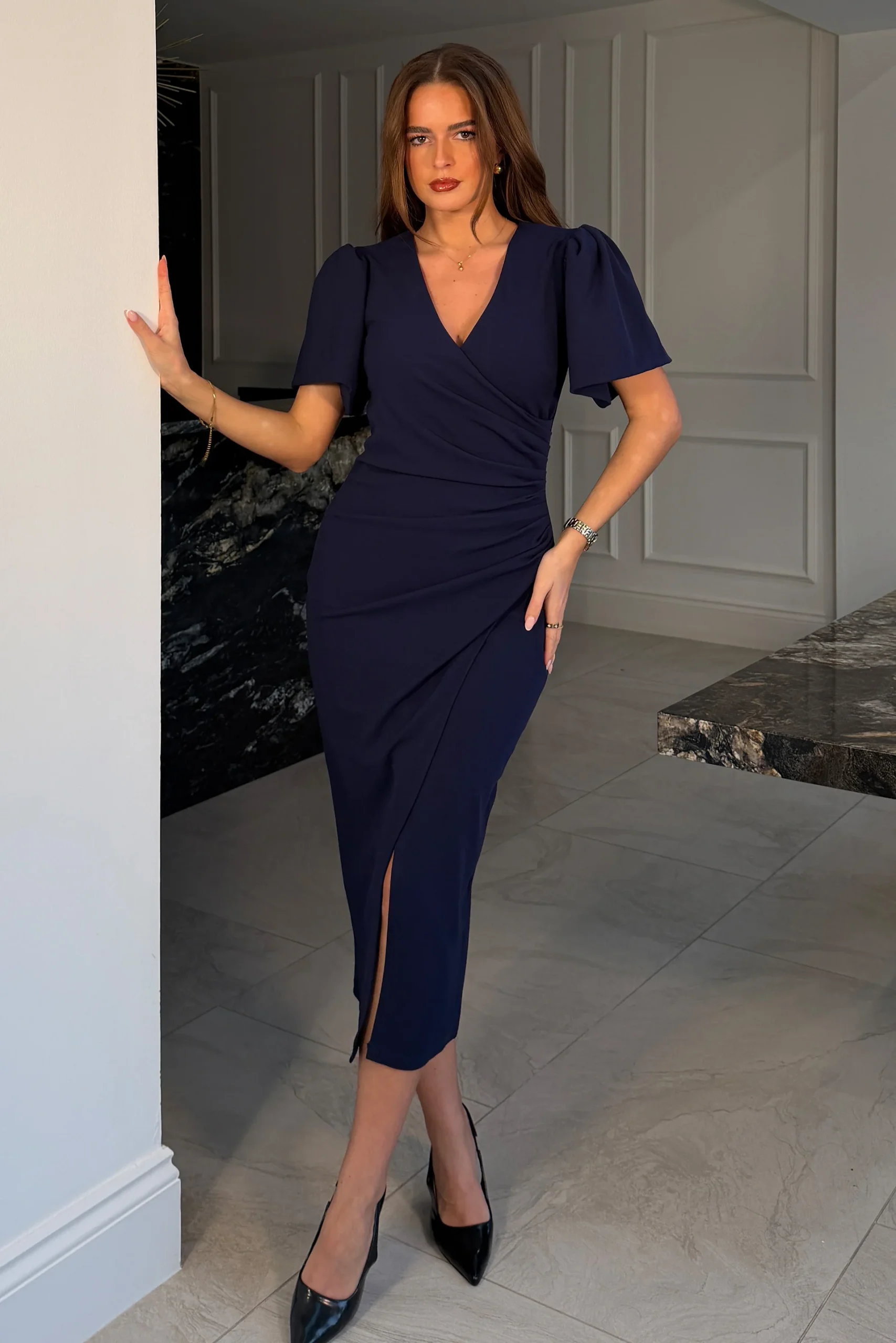Exude elegance and sophistication in our Freya Puff sleeve midi with wrap neckline and a ruched waistline. The statement puff sleeves add a timeless, fashionable touch, while the premium stretch jersey fabric ensures total comfort. This NAVY piece is perfect for any occasion.