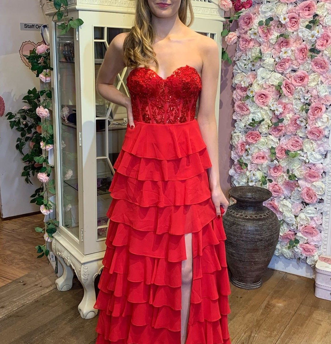 Step out in ultimate style in the charming Gloria Strapless Corset Ball Gown in ravishing RED. Exuding confidence and elegance this beautiful gown features a boned corset creating a flattering silhouette together with a layered chiffon skirt finished with a high leg slit.