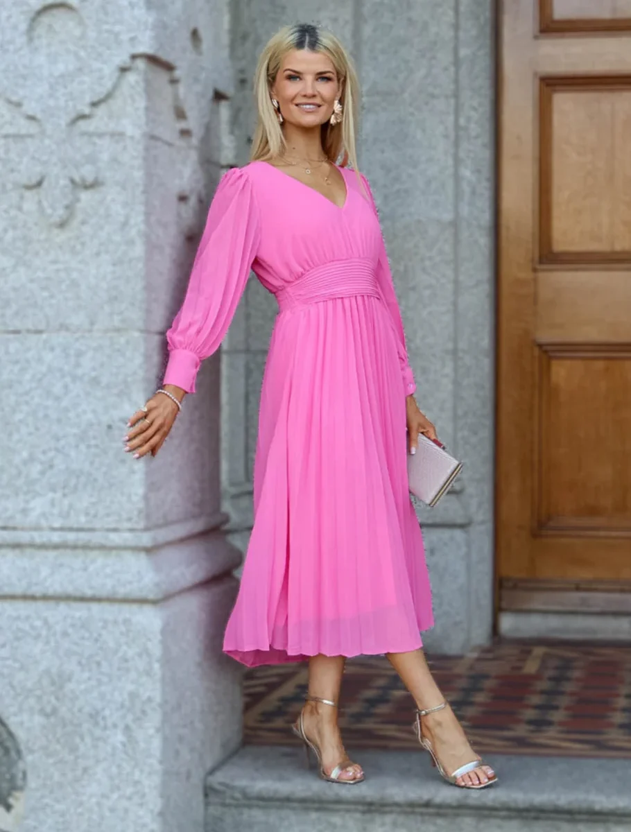 Be pretty in PINK this Summer in our beautiful Hannah Pleated Midi dress. This Midi dress features, a Pleated skirt, an Empire waistline with elasticated back, Underlining, Pleated Long Sleeves, a V neckline and Cuffed Sleeves.