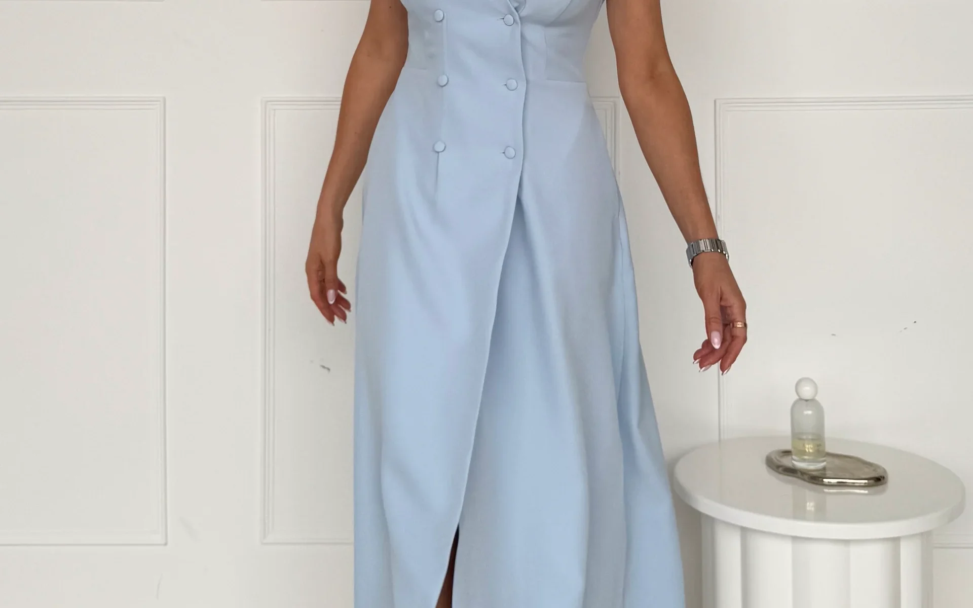 Feel confident in our Hazel Midi Dress in a sophisticated Sky Blue. Designed with a tailored fit, high quality fabric, double breasted design and clean fit and flare silhouette. Perfect for a day at the office or drinks out with the girls. Style it with heels or pumps for a perfect look!