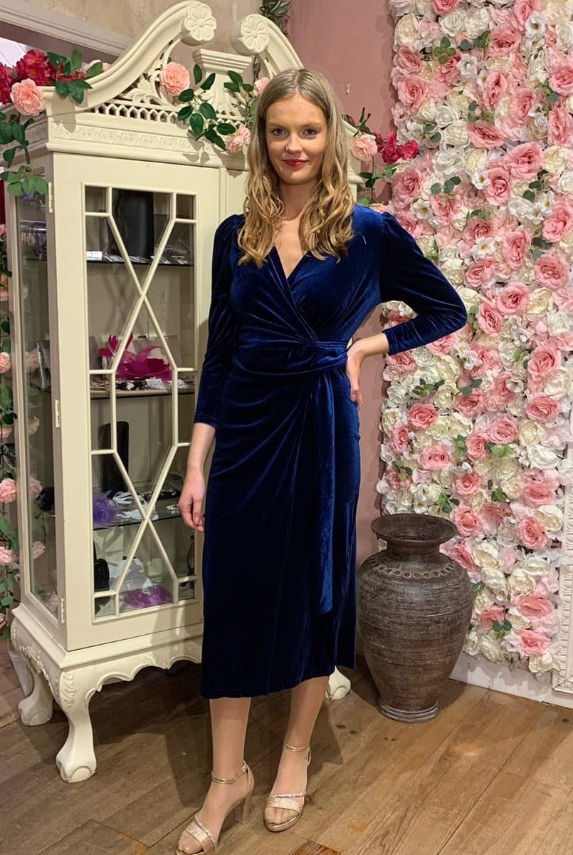 You will feel confident and chic with the Hollie Wrap Midi Dress in beautiful BLUE velvet. Elegant & sophisticated this wrap style will flatter your silhouette and add glamour to your look, making it the perfect choice for any special occasion.