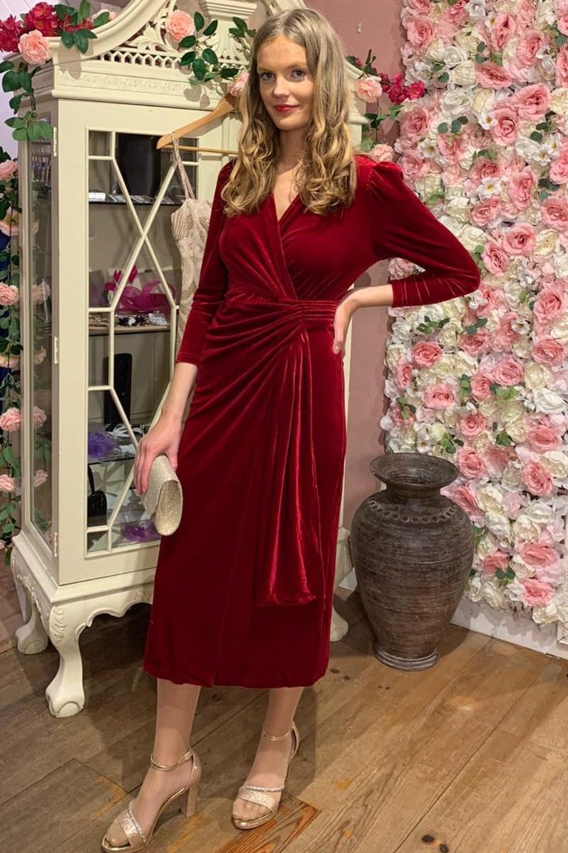You will feel confident and chic with the Hollie Wrap Midi Dress in RED velvet. Elegant & sophisticated this wrap style will flatter your silhouette and add glamour to your look, making it the perfect choice for any special occasion.
