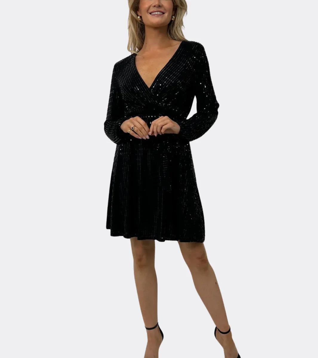 Perfect for the Party Season, the Kylie Mini in BLACK is an Eye-catching little black dress adorned with sparkling embellishments. It features a chic tie belt to cinch the waist and enhance your figure, short hemline for a fun, flirty look. Perfect for parties, night outs, or special events.