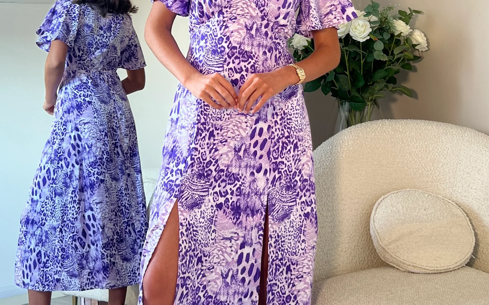 Introducing the beautifully crafted the Levi midi dress with elegant Angel sleeve, now in a pulsating Purple Animal print. Featuring a plunging neckline, a clinched in waist and side split, the Levi is designed to flatter and accentuate your look whatever the occasion.