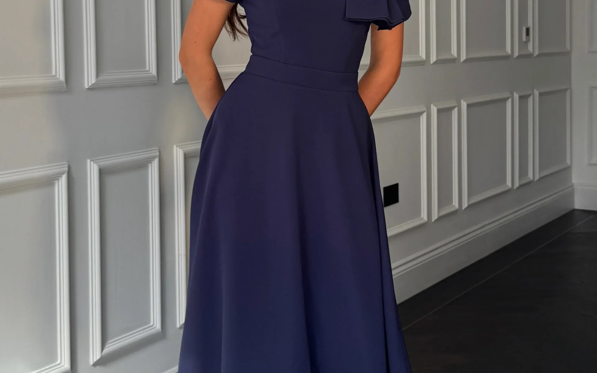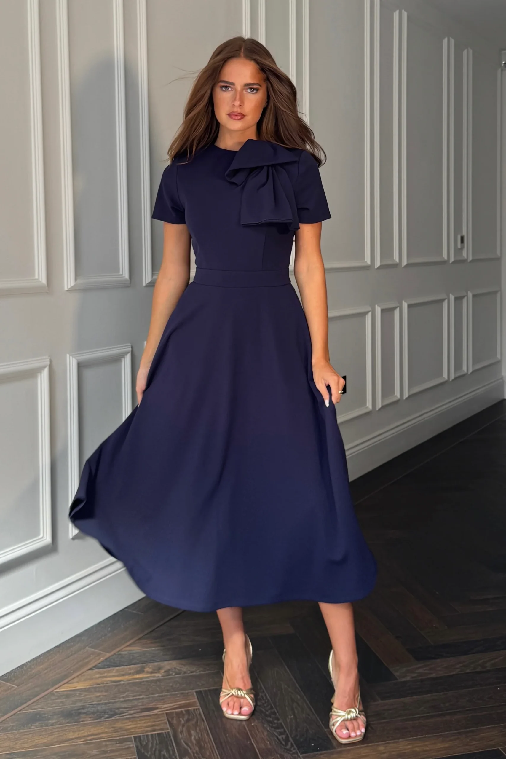 Give your look a statement twist with our stunning Minta Bow Detail Midi Dress in Navy blue. Featuring statement bow, floaty skirt and elegant short sleeve. This dress will make a statement at any occasion.