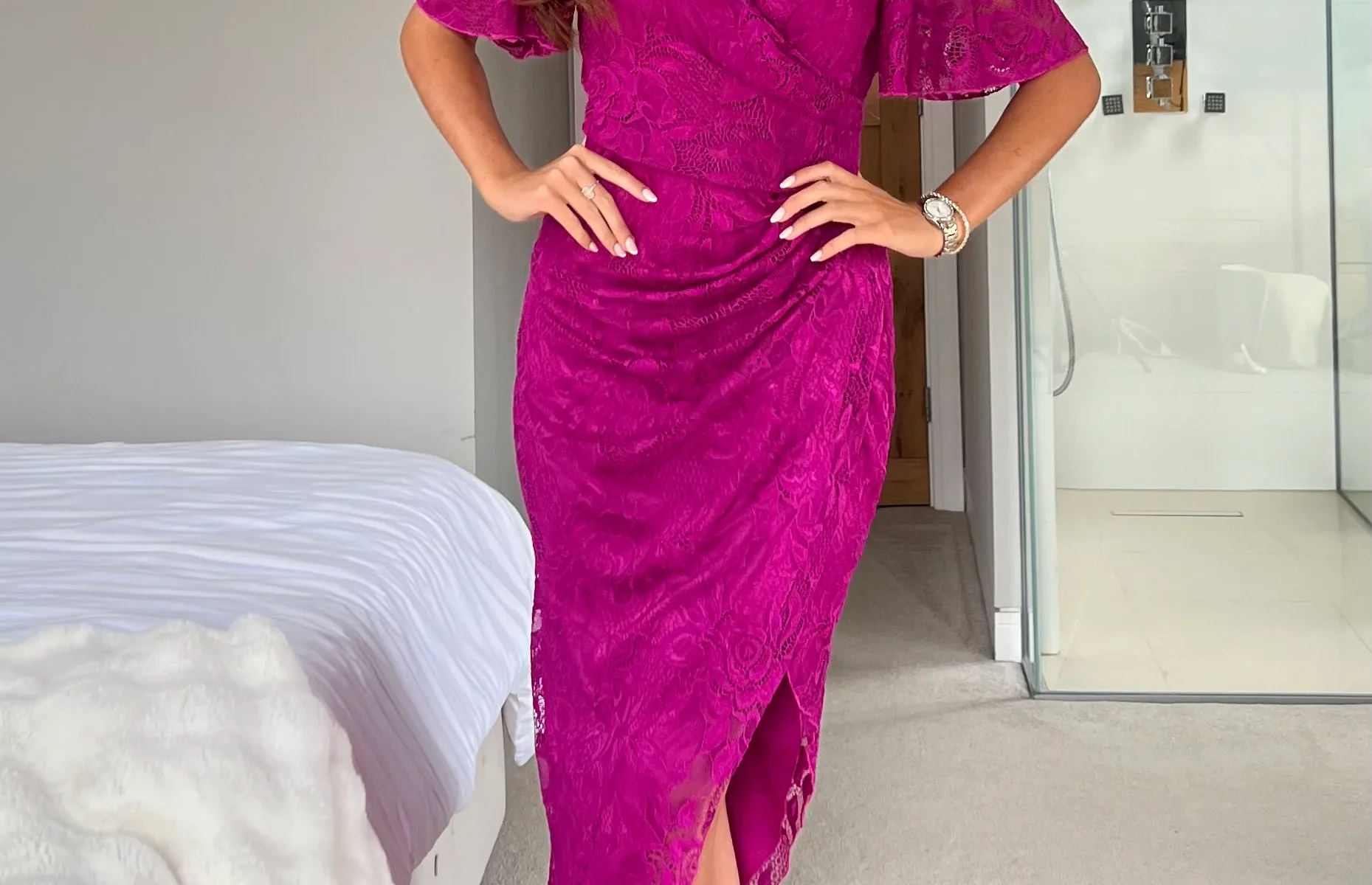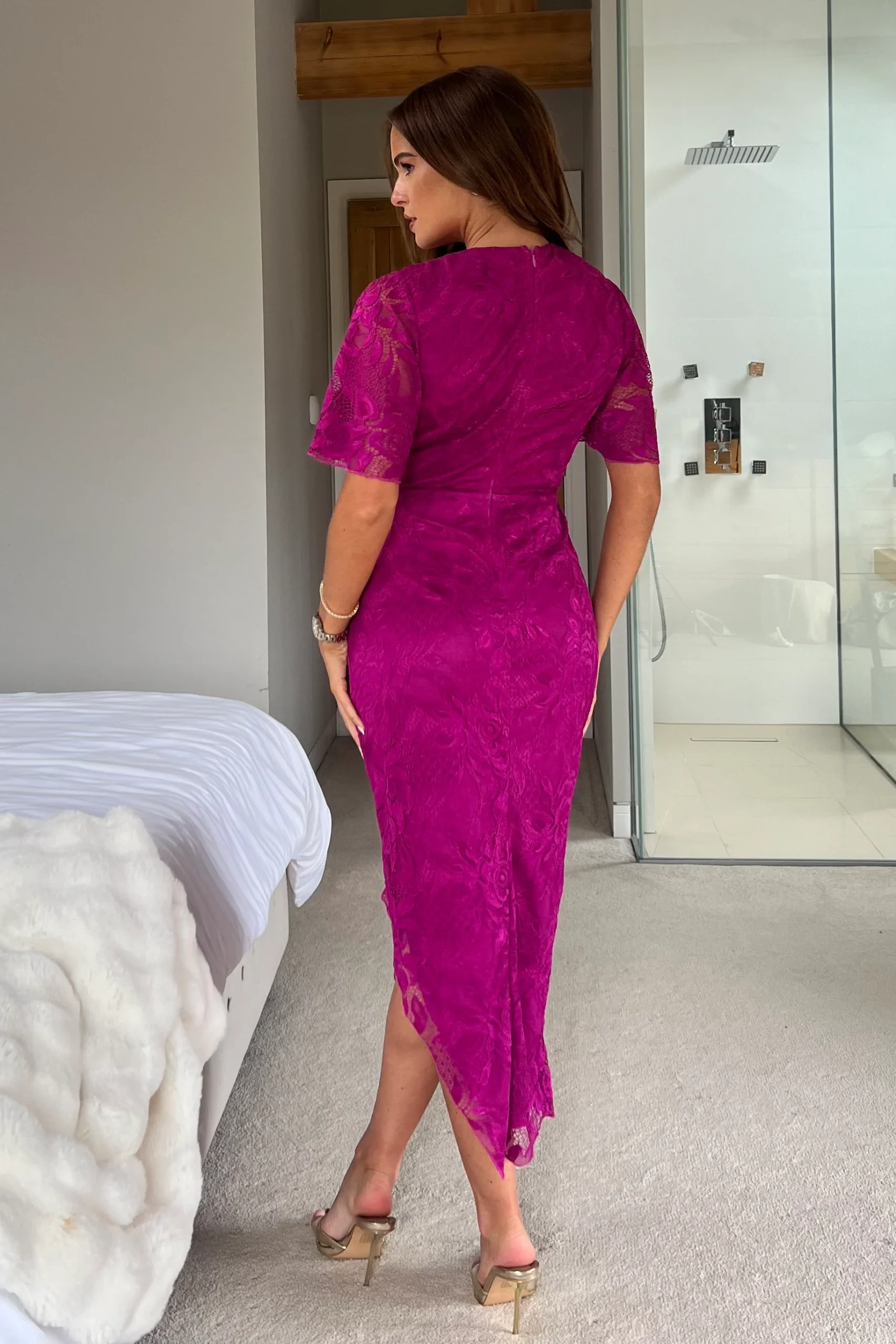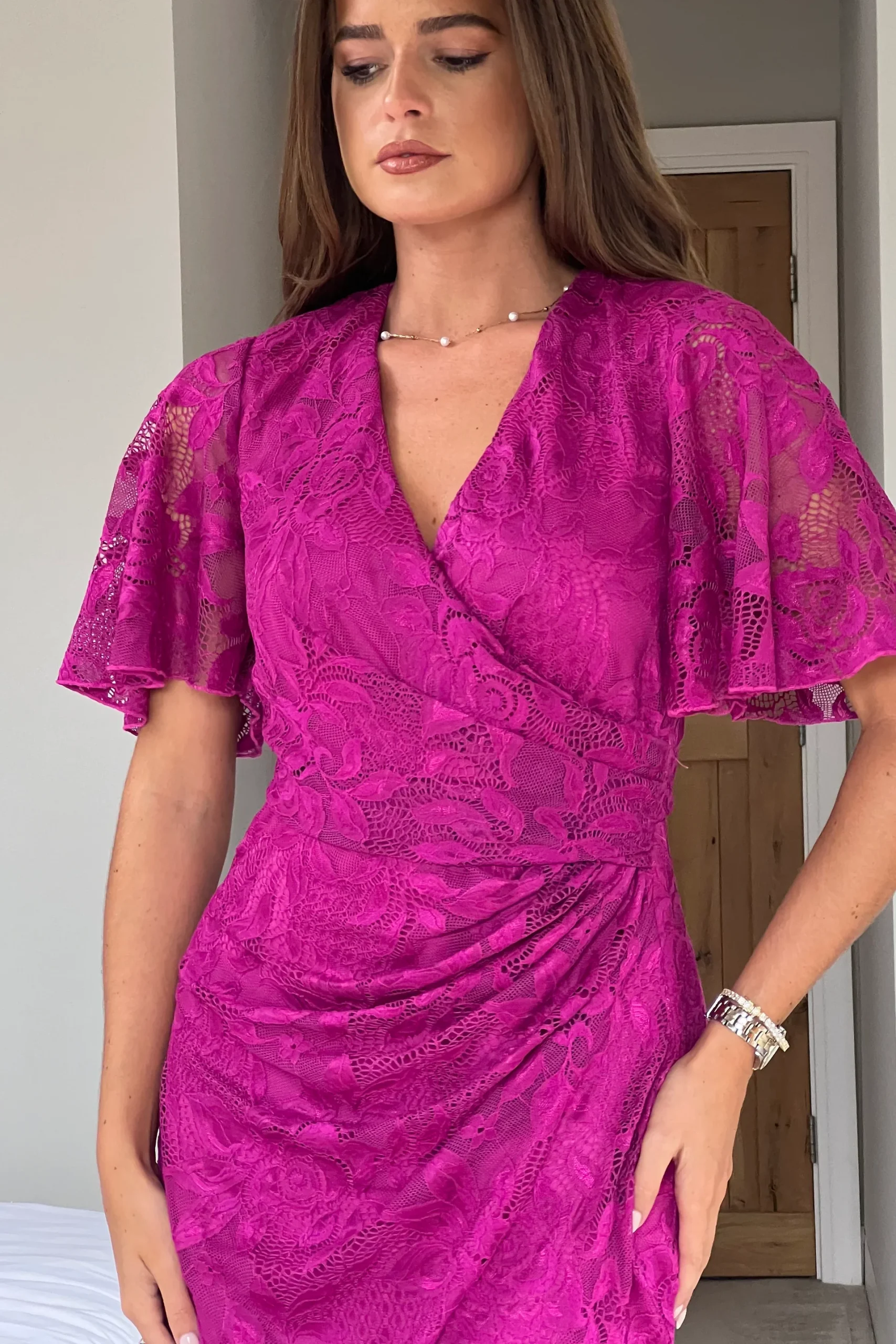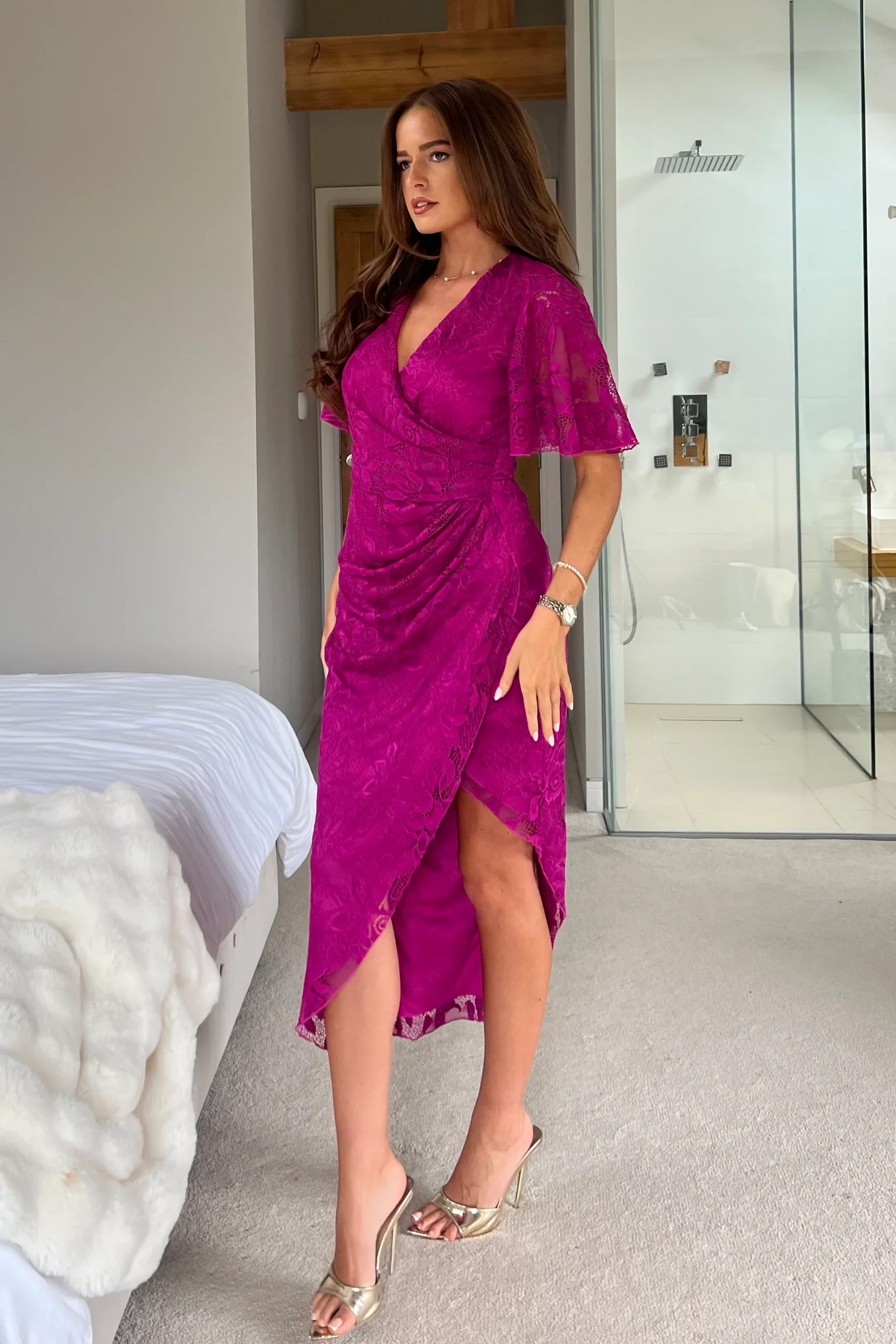 Make the most of every occasion this season in our beautiful Natasha midi dress in fabulous FUSCHIA Pink. Featuring a feminine wrap over neckline and floaty angel sleeves for a chic look. The wrap over design with ruched detailing cinches you at the waist and creates the most flattering silhouette that compliments your curves. Crafted in a vibrant print, this midi dress will be your go to look!