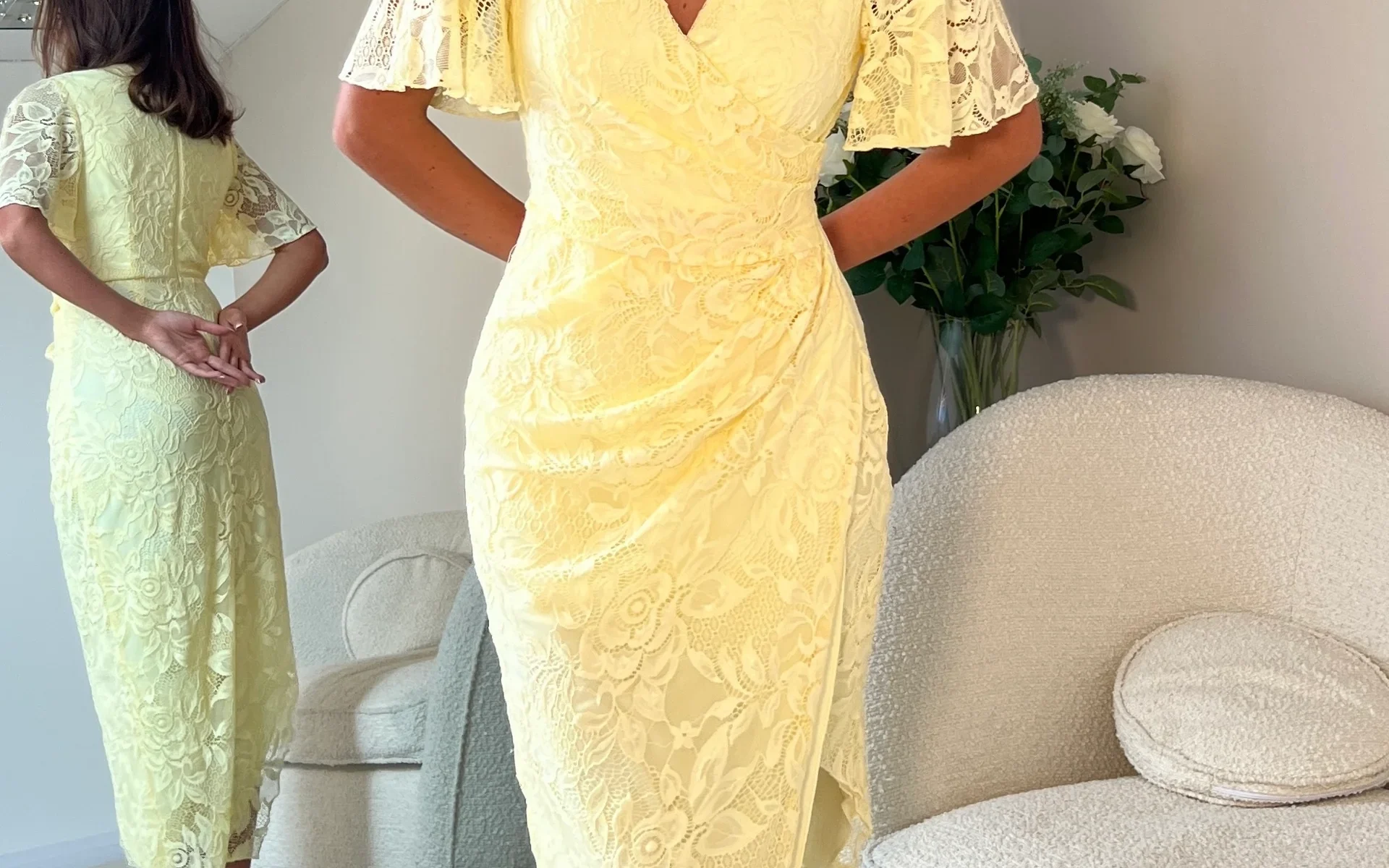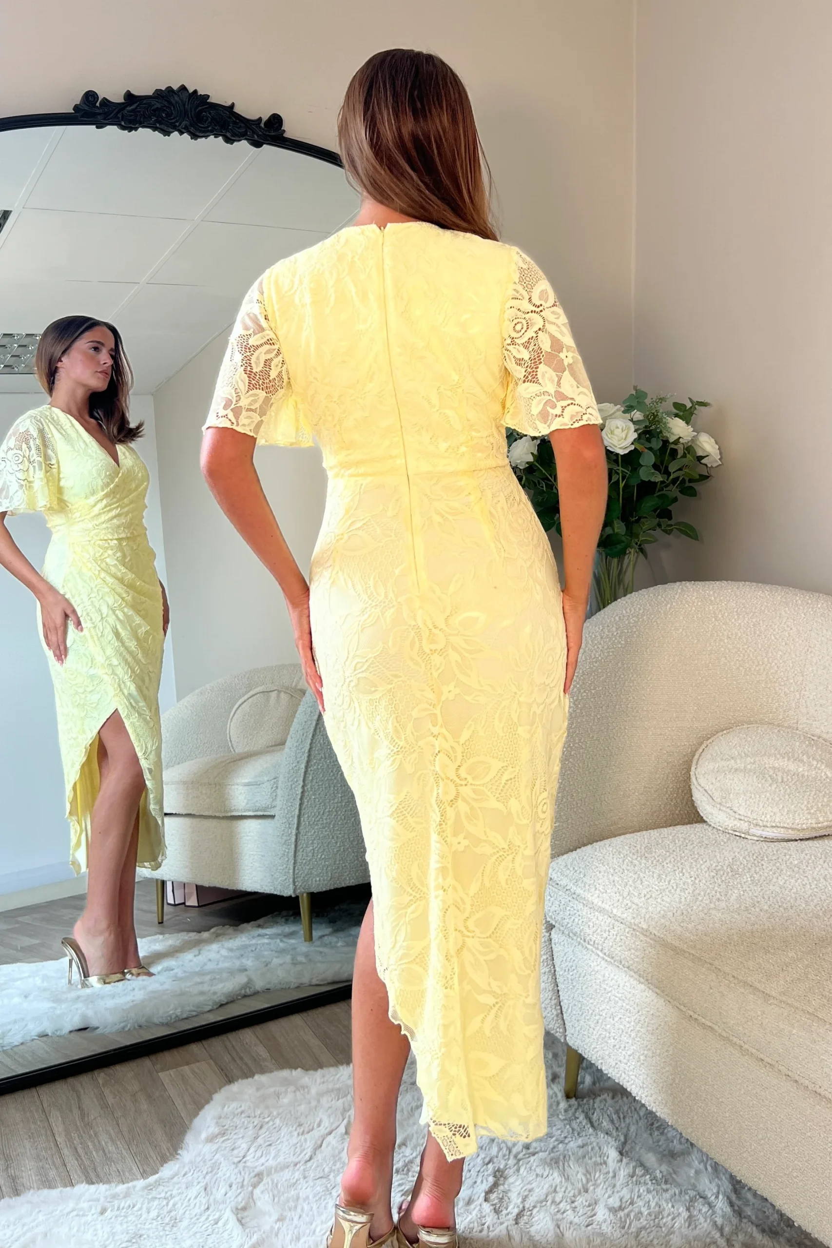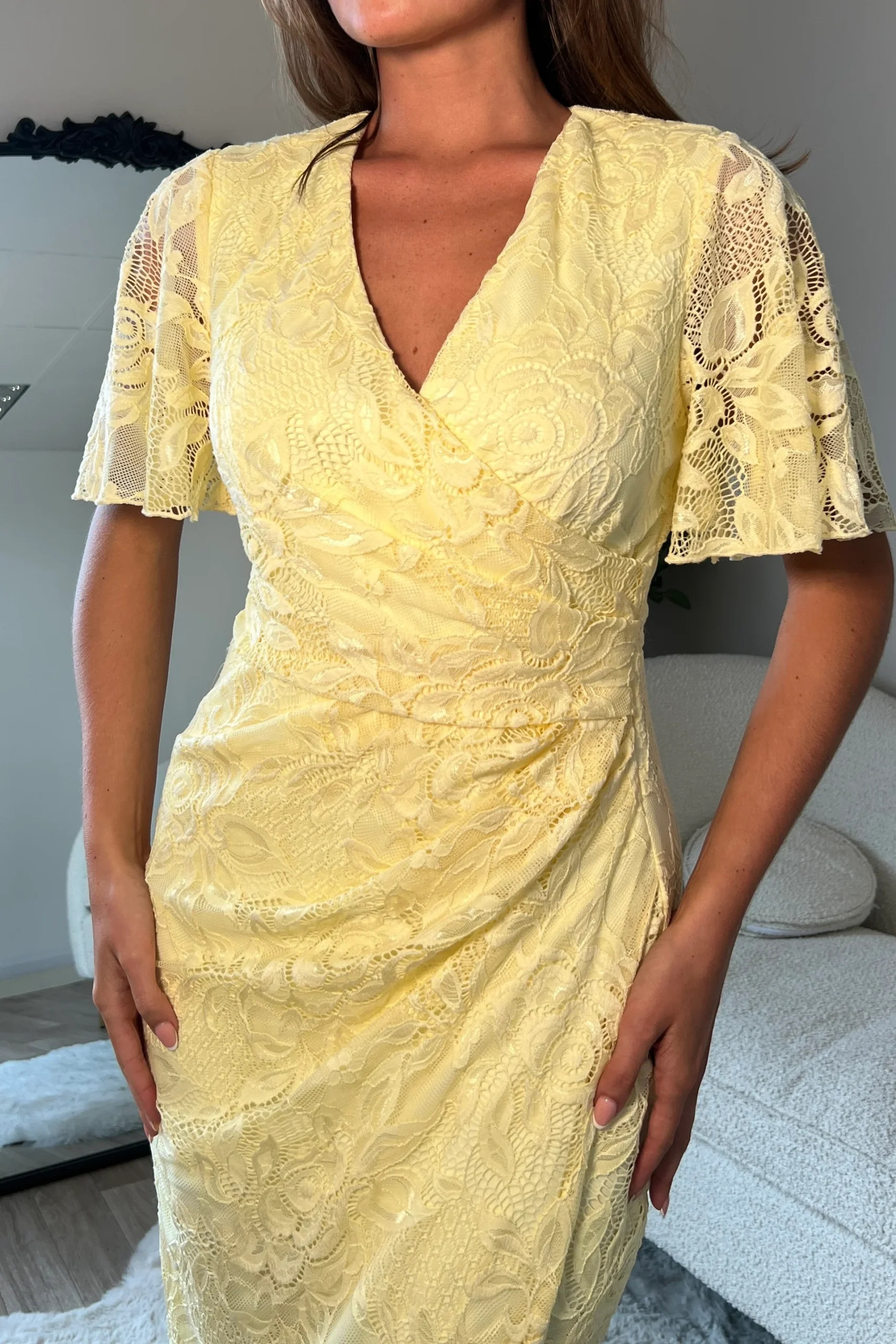 Make the most of every occasion this Spring in our beautiful Natasha midi dress in seasonal Yellow. Featuring a feminine wrap over neckline and floaty angel sleeves for a chic look. The wrap over design with ruched detailing cinches you at the waist and creates the most flattering silhouette that compliments your curves.
