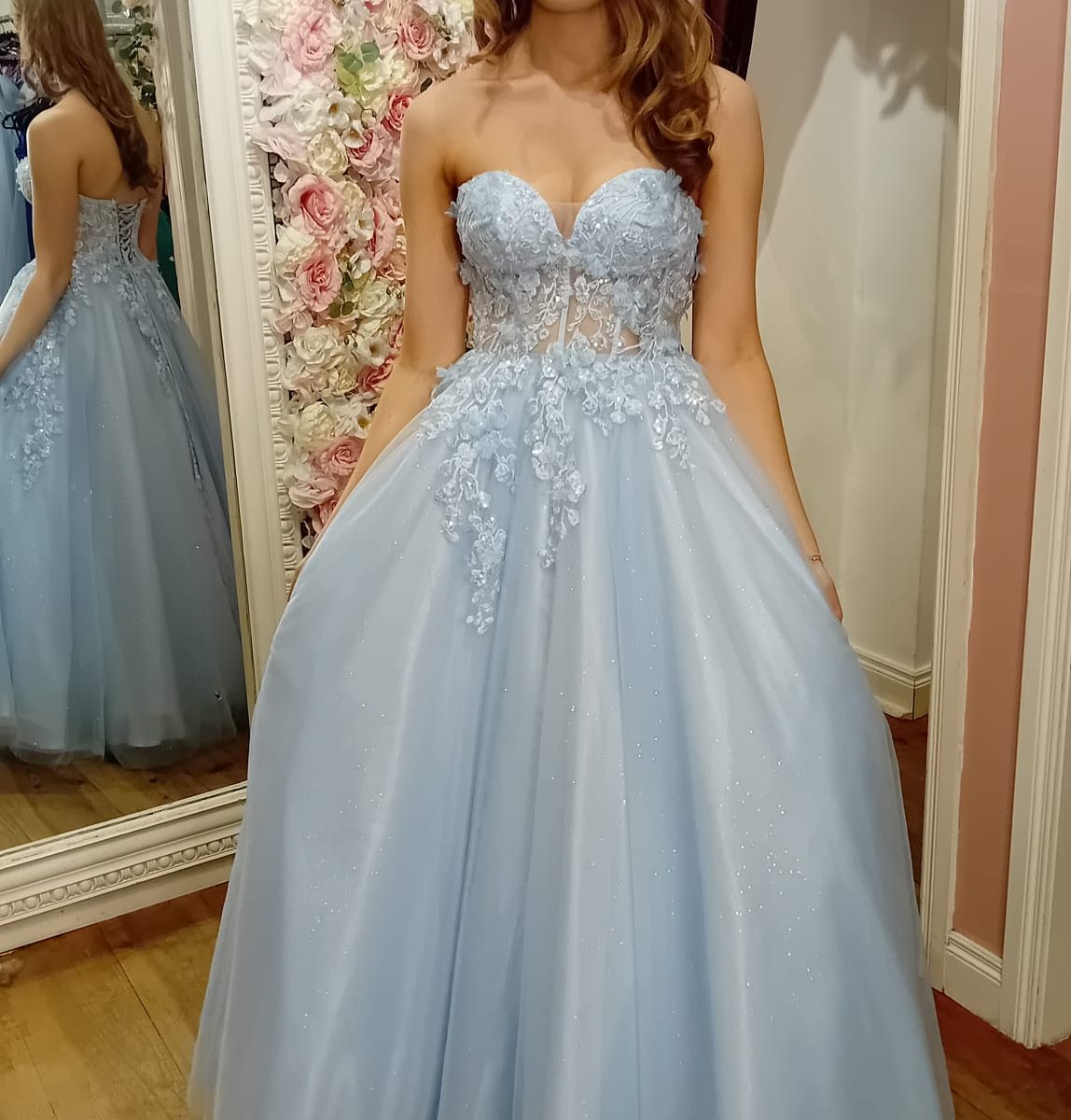 You’ll be certain to look your best in the Abbie Corset Ball Gown. This Pale Blue dress exudes confidence, elegance, with a touch of sparkle. Featuring a Sweetheart neckline with a corset style lace-up back that ensures a perfect fit and creates a stunning visual detail at the back.