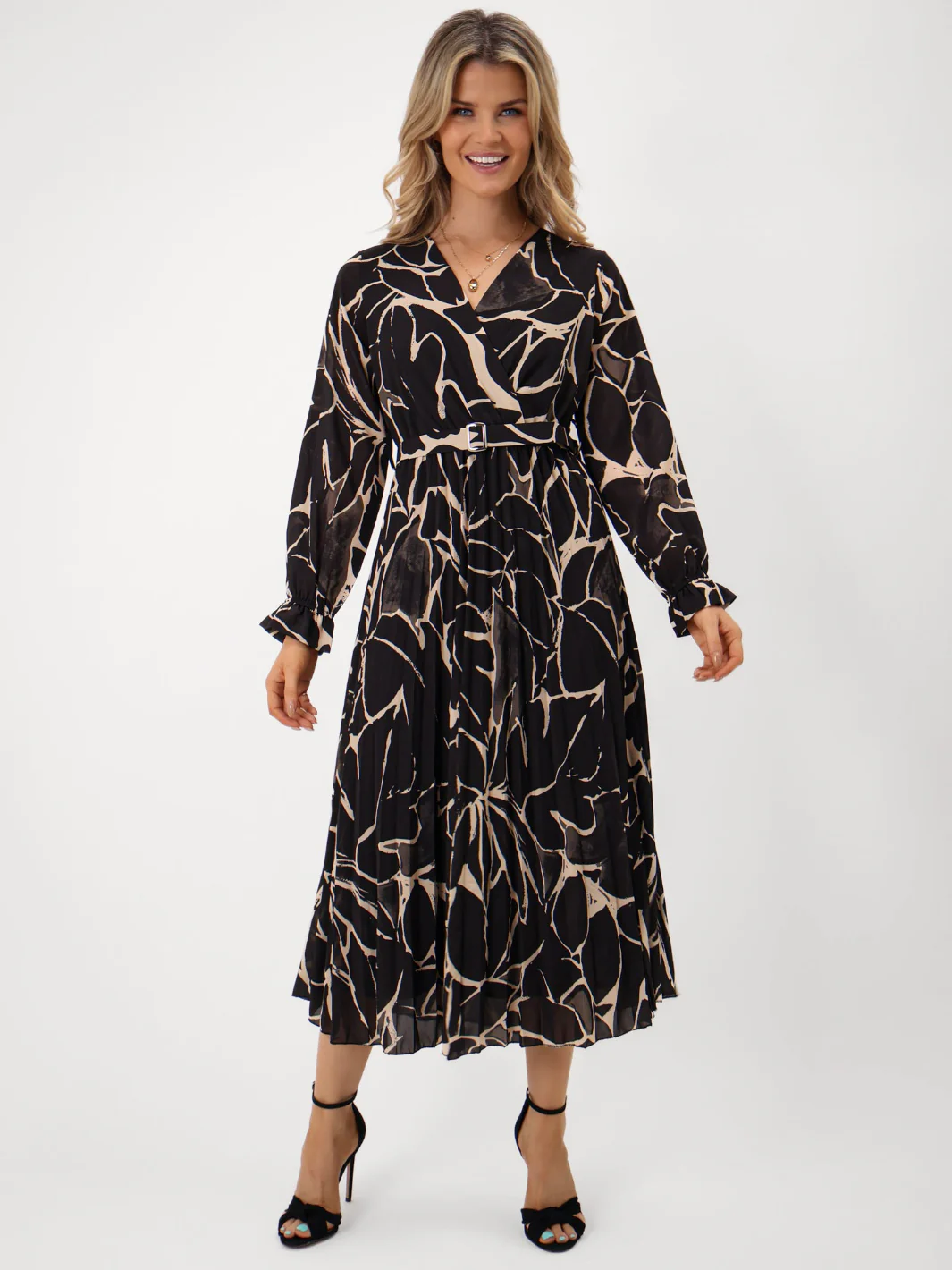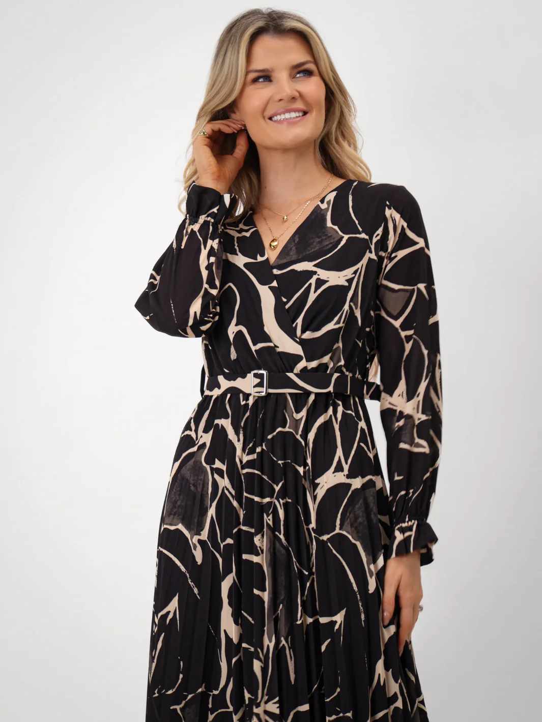 Step out in style this Autumn season in the Positano Belted Pleated Midi Dress in a sophisticated BLACK print. Featuring a soft V-neckline, long sleeves with elasticated cuffs, and a belted waist to define your silhouette, it flows into a beautifully pleated midi skirt. Perfect for any occasion, style with heels for an elevated look or dressed down with boots for everyday elegance.