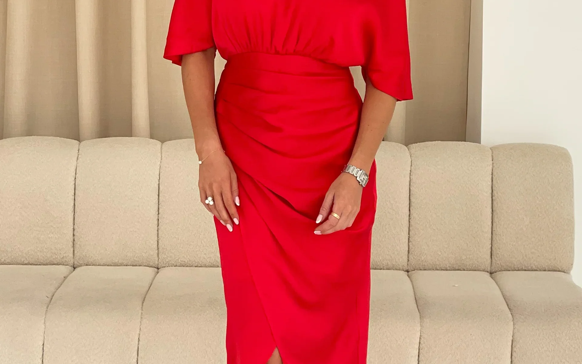 Indulge in the sophistication and elegance of the Shelly Pleated Midi Dress in radiant Red. Crafted from a soft and lightweight fabric, evoking a sense of natural elegance. The elegant neckline and flutter sleeves add a touch of modernity, while the carefully placed ruching along the waistline creates a flattering silhouette. A subtle front slit adds a hint of allure.