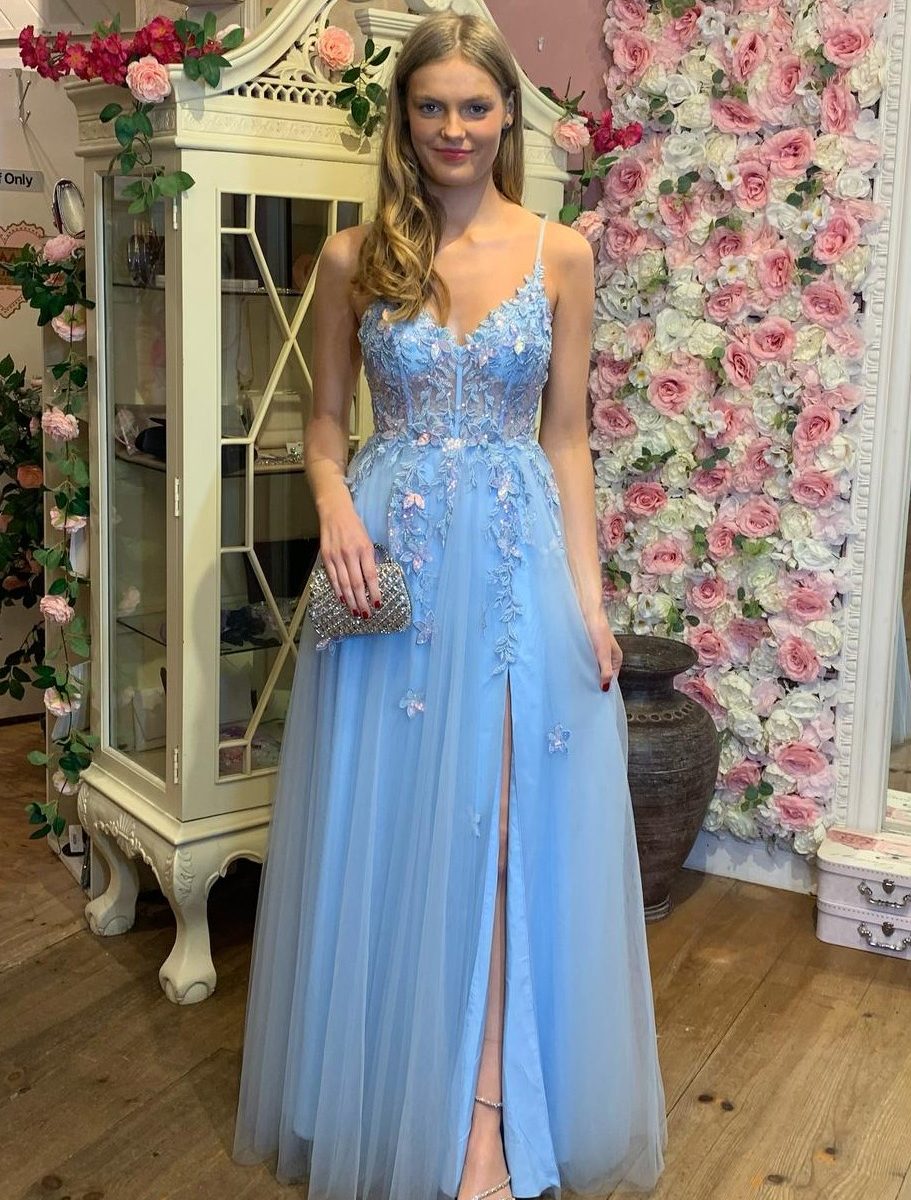 Introducing the Tania Tulle Corset Ball Gown. This full length Pale Blue dress exudes confidence and elegance, with a touch of sparkle. Featuring a Sweetheart neckline with a pretty 3d floral and sequin bodice, lace up back detail for that perfect fit.