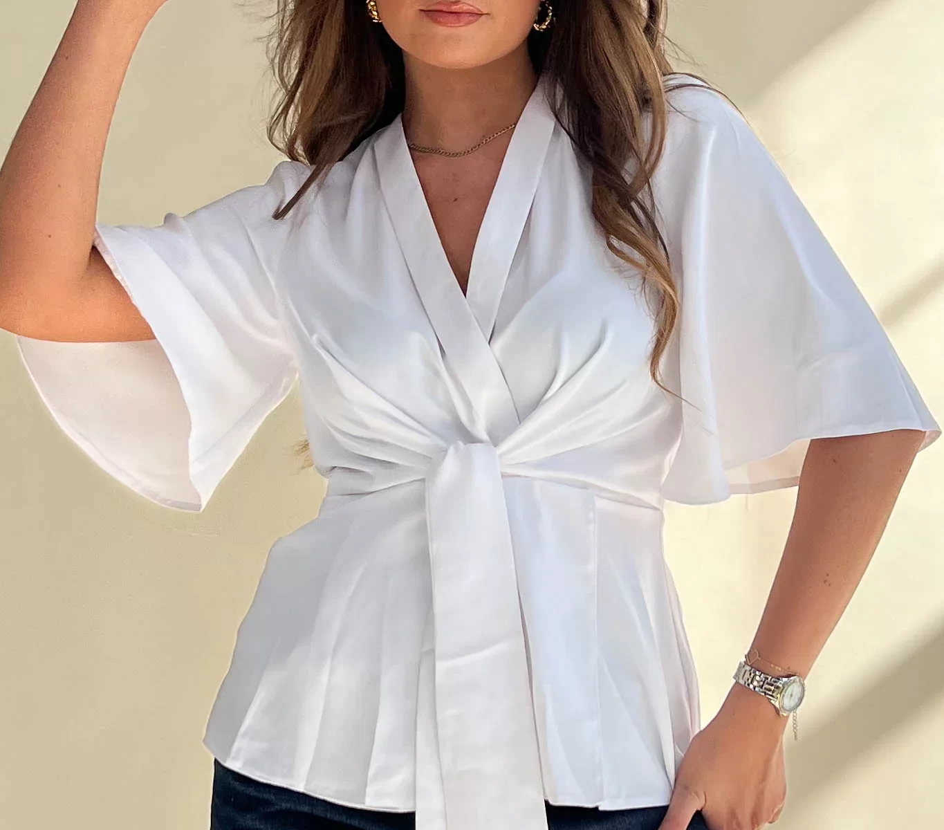 Our Winona tie detail top is the perfect addition to your wardrobe with its versatile design and relaxed fit. Featuring a wrap over neckline and tie detail at the waist to cinch you in, this top creates the most flattering & feminine silhouette. This statement staple is the style you will wear on repeat.